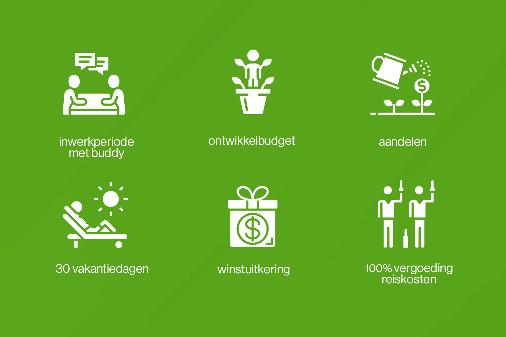 - Mogelijkheid om bedrijfsaandelen te kopen (bij vast contract)